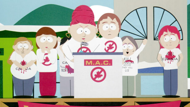 Todo lo contrario que lo que le sucedió a "South Park: Más grande, más largo y sin cortes", la gamberrada perpetrada por Trey Parker, que consiguió recaudar más de 80 millones de dólares en todo el mundo contando con un presupuesto de apenas 20. Yo pude verla en una sala de multicines a media entrada en la que los espectadores disfrutaban con cada una de sus gamberradas, pero cuenta la leyenda que, al menos por toda España, fueron legendarias las escapadas de padres arrastrando a niños pequeños fuera de la sala tras comprobar que aquella película de dibujos animados era de todo menos familiar e inofensiva. El caso es que, vista veinte años después, resulta encomiable el esfuerzo denodado de Stone por hacernos creer que lo que estamos viendo es una sarta de chorradas y provocaciones más bien propias de adolescentes cuando lo cierto es que es una película política mucho más cuidada de lo que parece en lo formal (ahí están las magníficas canciones de Marc Shaiman que incluso les valieron una nominación al Oscar) y con un discurso profundamente coherente.