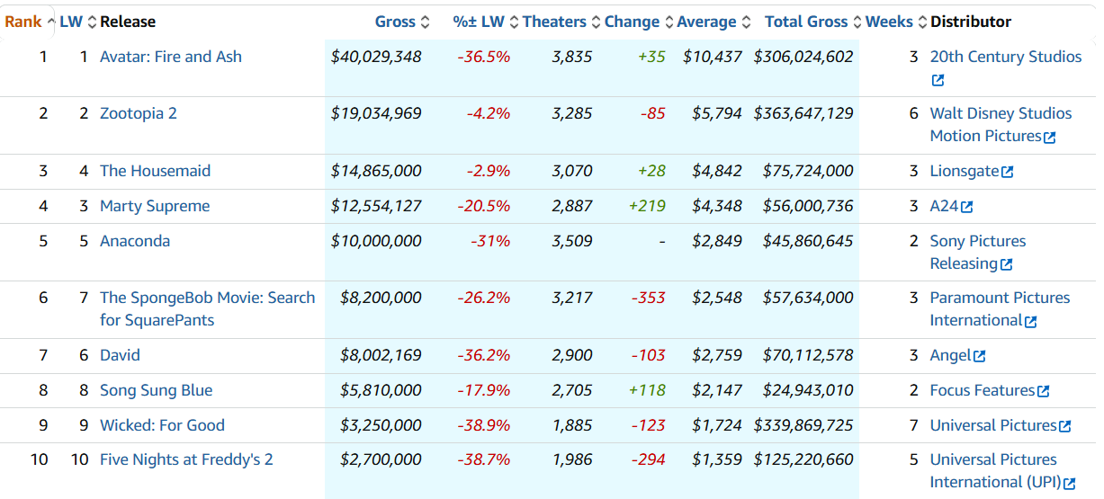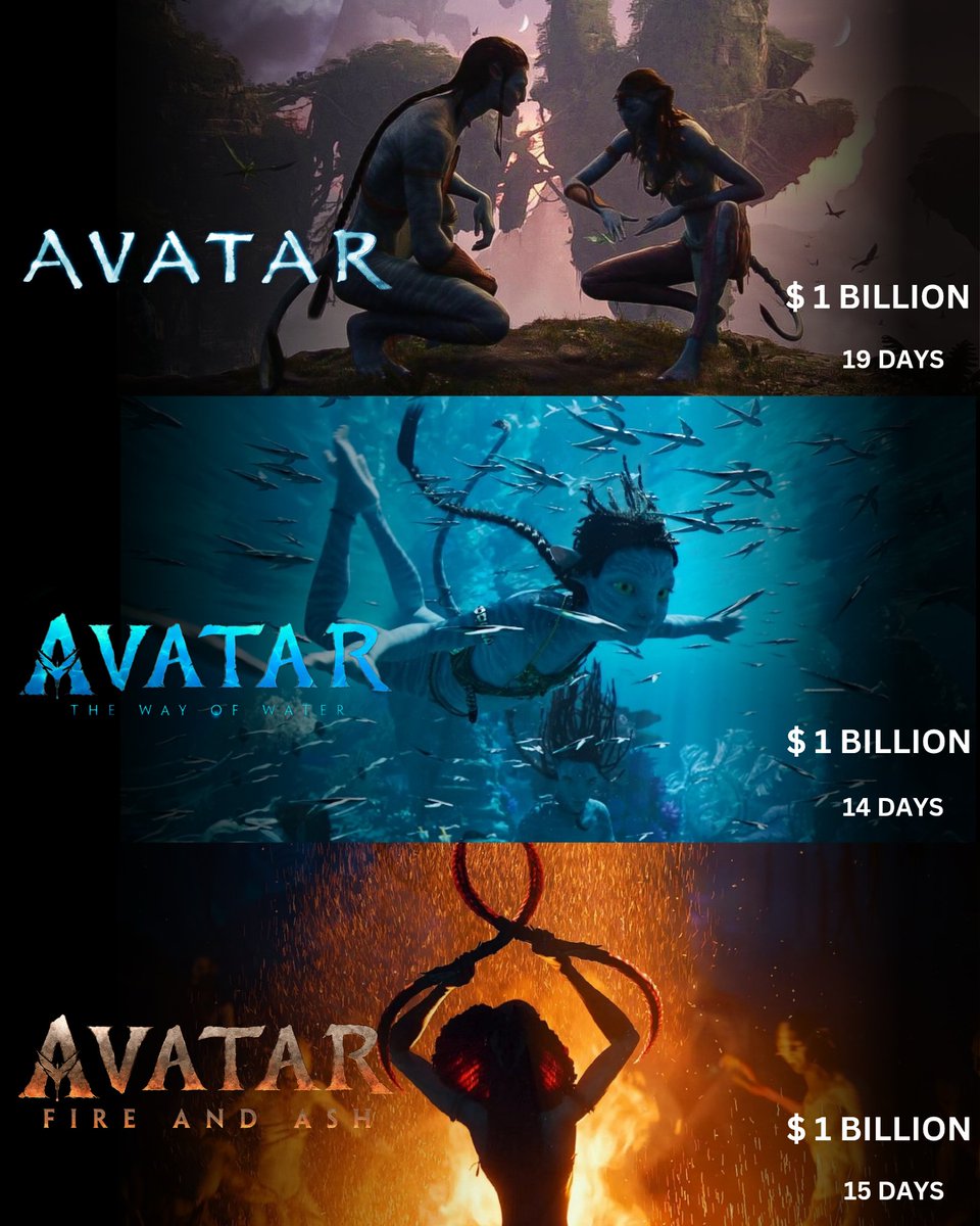 Seguimos hablando de “Avatar: Fuego y ceniza” en su tercer fin de semana en taquilla. Tras cumplir lo esperado en su estreno y ralentizar su descenso en el segundo fin de semana suma 40 millones y logra superar los 1.000 millones en la taquilla mundial en sólo 18 días. James Cameron es el primer director en lograr este hito en cuatro de sus películas ("Titanic" en primer lugar y la trilogía de "Avatar" después).
