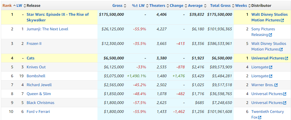 “Star Wars: El ascenso de Skywalker” ha entrado directamente en el primer puesto de la taquilla USA como no podía ser de otra manera. 175 millones de dólares para una cinta que, a pesar de las críticas, tiene asegurado el interés y los dólares. Eso sí, queda por debajo de los 247 de “El despertar de la fuerza” y los 220 de “Los últimos jedi”. El otro estreno de la semana es "Cats" que confirma el fiasco y los temores con sólo 6,5 millones en su primer fin de semana.