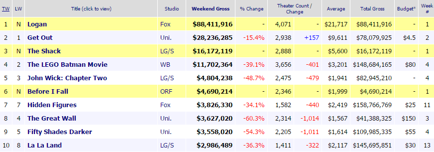La despedida de Hugh Jackman como Lobezno ha sido recibida con interés por parte de la taquilla USA que ha llevado a “Logan” al primer puesto con 88´4 millones de dólares. Una cinta encumbrada por la crítica que también va de la mano del público y que es la película calificada “R” con mayor recaudación en un mes de Marzo superando los 70´8 de “300”. En cambio sólo puede ser la cuarta dentro de la saga X-Men (será por ser la más adulta) y, al menos, sí que supera levemente a “X-Men orígenes: Lobezno” que tuvo 85´05 millones en 2009 y a "X-Men 2" que cosechó 85´55 en 2003.