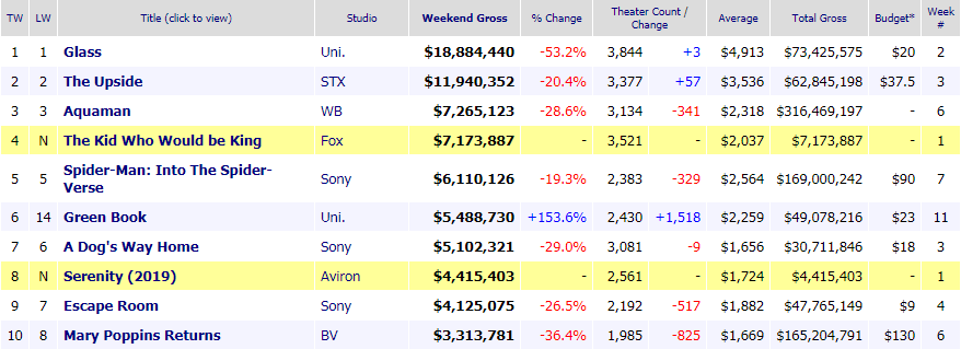 "Glass" comanda por segunda semana consecutiva la taquilla USA con 19 millones de dólares que ofrecen un acumulado de 73,6. “The upside” y “Aquaman” completan el pódium pero destaca el estreno de “El niño que pudo ser rey”, lo nuevo de Joe Cornish (“Attack the block”) y que tiene como protagonista a Louis Serkis, hijo de Andy Serkis, en una cinta que lleva a nuestros días la leyenda artúrica.