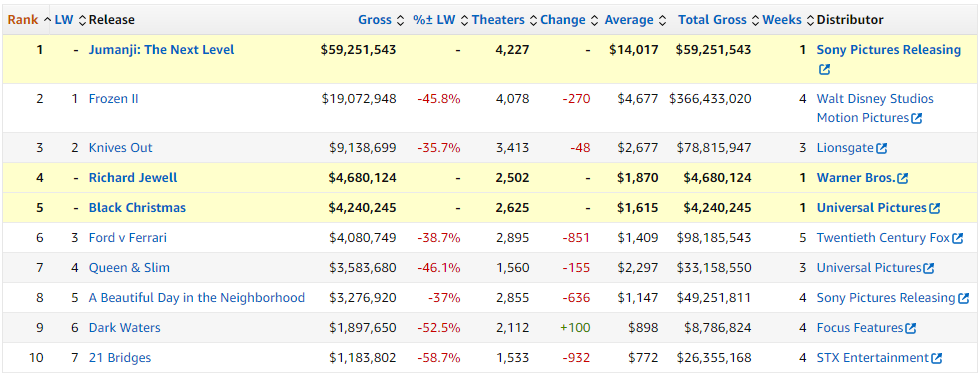 “Jumanji: Siguiente nivel” lidera con 59,2 millones seguida de “Frozen II” (19 millones y un acumulado de 366) y “Puñales por la espalda” (9,13 millones y un acumulado de 78).