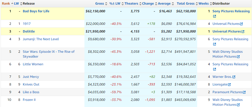 “Bad boys for life” le gana la partida a “Las aventuras del Doctor Dolittle” y llega a ser el mejor dato de la saga protagonizada por Will Smith y Martin Lawrence con 62,1 millones de dólares. Por su parte la cinta animal protagonizada por un Robert Downey Jr. más ventrílocuo que nunca es tercera con 21,9 millones quedándose a un suspiro de “1917” que cae al segundo puesto con 22 millones de dólares.