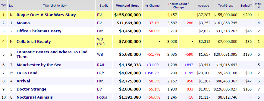 A destaca el batacazo de "Belleza oculta”, la nueva y capriana película protagonizada por Will Smith que sólo puede ser cuarta con 7 millones de dólares. Eso sí, se calienta la temporada Oscar con la entrada de “La la land” presente en 200 salas y siendo la segunda mejor media por copia de la semana sólo por detrás de la cinta de Gareth Edwards.