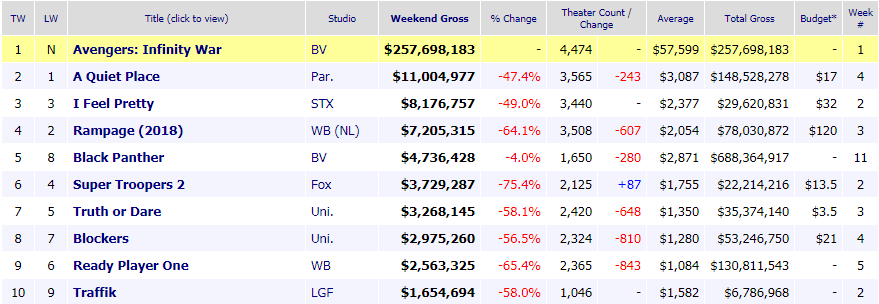 Tenía la marca por batir de “Star Wars: El despertar de la fuerza” pero “Los vengadores: Infinity War” ha conseguido el mejor estreno en su primer fin de semana de cualquier película en la taquilla USA. 250 millones de dólares además de unas críticas que hablan de ella como una reinvención del blockbuster moderno y que, además, y como suele pasar en las cintas de Marvel, ha cosechado buenas recepciones.
