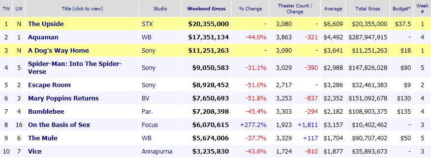 Nicole Kidman reina por partida doble la taquilla de este pasado fin de semana en USA con dos películas certificando que la actriz sigue en un gran momento ya que todavía tiene, además, pendiente de estreno, sus títulos potentes del año como son “Destroyer” e “Identidad borrada” que, no obstante, parece que volverán a dejarla fuera de las candidaturas al Oscar. Todo sin hablar del estreno de la segunda temporada de "Big little lies" que se espera para este 2019. “Aquaman” ha caído al segundo puesto en su cuarta semana pero es “The upside”, el remake USA de “Intocable”, el que encabeza la taquilla con 20,3 millones de dólares.