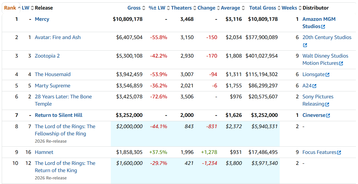 El temporal invernal que ha asolado Estados Unidos tiene su impacto en la taquilla en la que, al menos, ha habido cambio de líder. “Sin piedad”, thriller distópico que nos lleva a un mundo marcado por la Inteligencia Artificial incluso para impartir justicia, debuta con unos exiguos 11,1 millones a la espera de que la apuesta de Amazon MGM Studios protagonizada por Chris Pratt y Rebecca Ferguson pueda encontrar algo más de amor dentro de unas semanas desde la plataforma. Por otro lado, se confirma el pinchazo de "28 años después: El templo de los huesos" cayendo un 72,6% respecto la semana anterior.