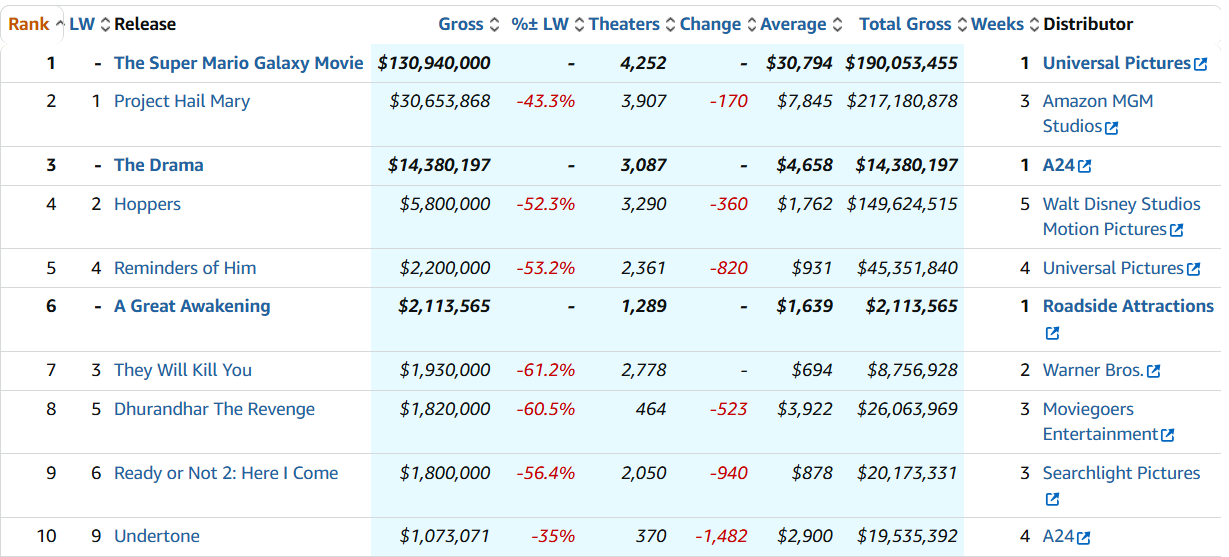 "Super Mario Galaxy: La película" es la continuación del universo del personaje de videojuego de Nintendo que ya dio grandes réditos a la taquilla hace tres años. Por las mismas fechas llega la nueva entrega que debuta con 190,1 millones en USA y un acumulado global de 372,5 millones. Se convierte en la única franquicia animada en la historia que debuta con más de 350 millones de dólares en todo el mundo con dos de sus películas.