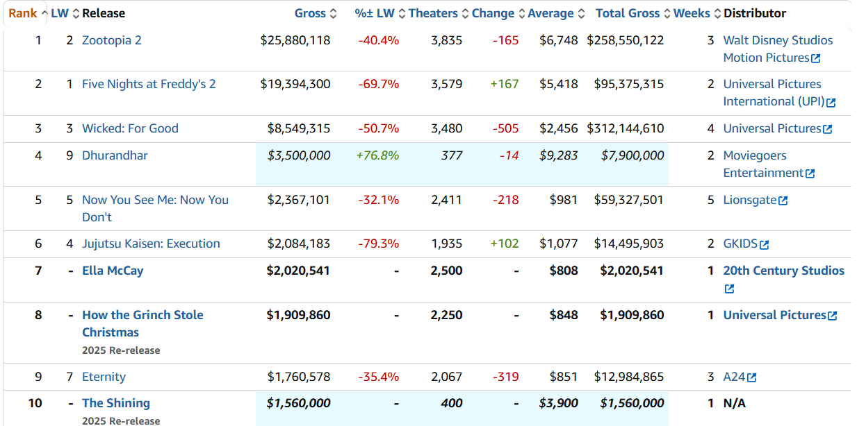 "Zootrópolis 2" recupera el liderato de la taquilla con una caída del 40% en su tercer fin de semana valorada en 26,3 millones de dólares. Son 259 millones en territorio USA pero en el mercado internacional el éxito es mayúsculo llegando a un global de 1.136 millones de dólares. “Five nights at Freddy’s 2” cae un 70% pasando a tener un 95,5 millones en USA y 173,8 millones a nivel mundial.