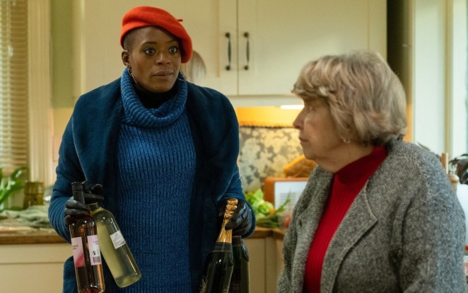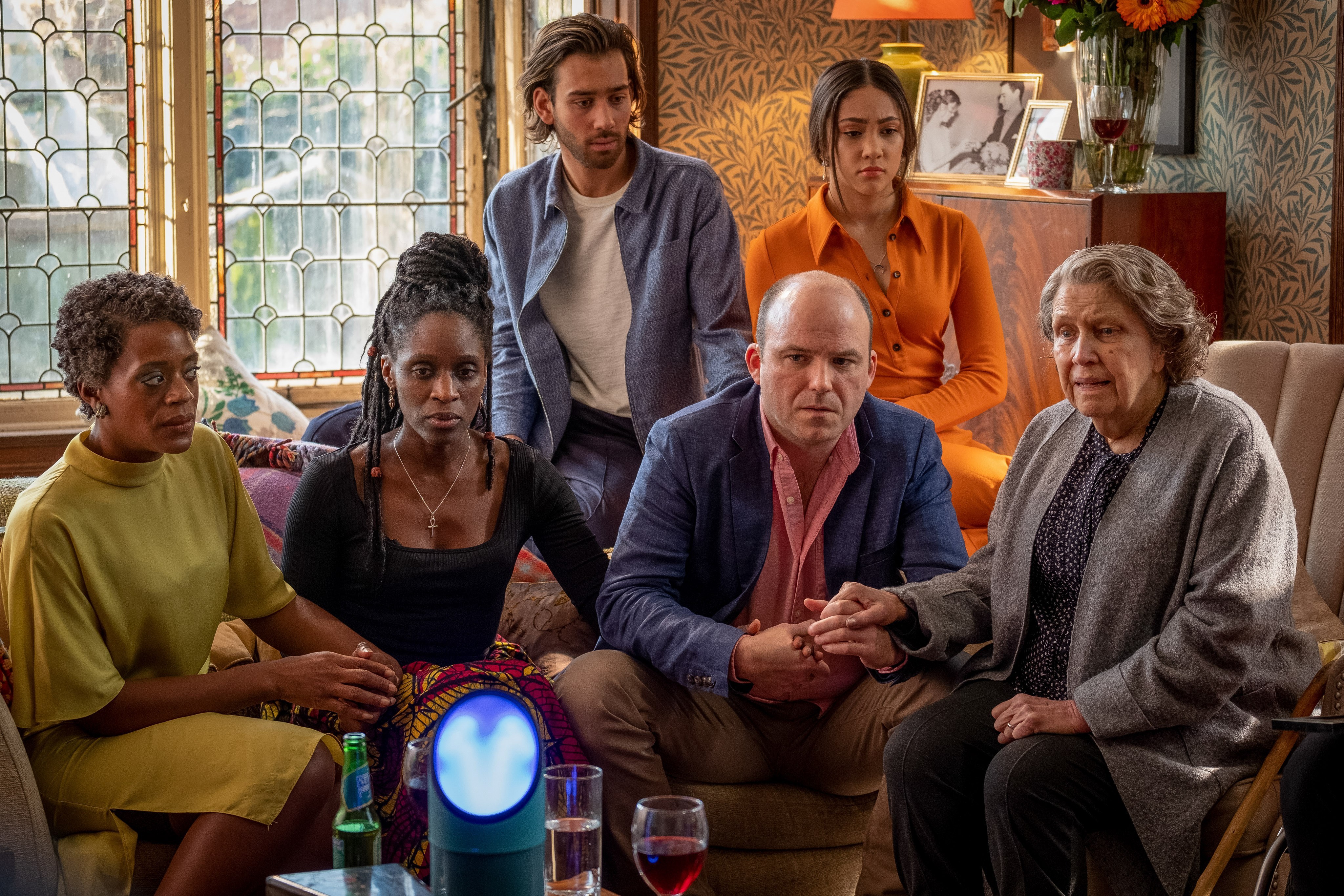 “Years and years” tiene los clásicos choques generacionales y de carácter entre los hermanos de cualquier serie familiar. Al ya citado Daniel se une el mayor de todos ellos, Stephen, un analista financiero que no sabrá ver el descalabro bancario que hará que tenga que vender su casa y reunir una serie de trabajos (entre 5 y 11) para poder llegar a fin de mes, la mayoría de ellos de mensajero o repartidor “uberizándose” todavía más el sistema profesional que no entiende de estudios o modos de vida previos. Los bancos, tan precavidos como especuladores, no pueden persistir ni garantizar los fondos frente a un sistema que se desmorona por el miedo, el caos y la deshumanización. La misma que lleva a los individuos a refugiarse en las nuevas tecnologías, bien sean llamadas colectivas de enlace familiar (a través de ese aparato al que llaman Señor como el miembro del clan que les une a pesar de la distancia) o filtros de Snapchat, conviviendo con el fracaso, como el del matrimonio del propio Stephen que, construido en cimientos no tan sólidos como intenta aparentar el paso del tiempo y la rutina en la que se termina recayendo, también se resiente con una mujer, Celeste, que ve como su tren de vida ya no va a volver, no sólo por la situación mundial sino por las decisiones (equivocadas) de su marido viéndose obligada a convivir con su suegra a la que terminará conociendo de verdad cumpliendo esa máxima de que el roce hace el cariño y que hay lazos afectivos que nacen y son tan importantes como los de la familia de sangre.