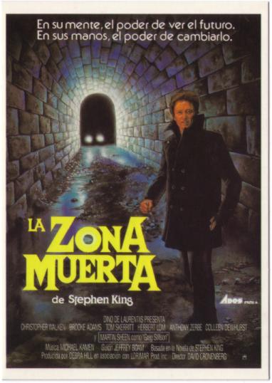 “La zona muerta” no deja de ser una de las adaptaciones más aplaudidas de King. Merito tiene también el particular estilo de David Cronenberg, que siempre saca petróleo de los problemas que surgen en la mente humana. En este caso, la historia gira en torno a un maestro de escuela, Johnny Smith, que después de despertar de un coma, encuentra que tiene poderes mentales. “La zona muerta” es uno de los pocos casos en los que King planificó de cabo a rabo el devenir de la historia, cuando lo habitual era que el autor escribiera sobre la marcha. Se dice que, en realidad, la trama se basa en la vivencia real del psíquico Peter Hurkos, quien tras golpearse la cabeza al caer por unas escaleras afirmaba que podía conocer detalles de las personas sólo con tocarlas.