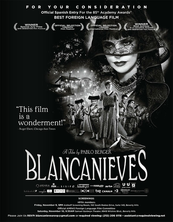 En primer lugar hay que fijarse en “Blancanieves” de Pablo Berger, la representante española para los Oscar. En principio no parece tener muchas posibilidades pero su buena acogida en Toronto contribuyó a que algunos críticos se fijaran en ella y supieran ver algo más que las referencias estilísticas que puede compartir con “The artist”. Cohen Media Group especializada en llevar cine europeo, especialmente francés, es la encargada de distribuir la película en USA en un año en el que son 71 las películas preseleccionadas. Será el 2 de Enero cuando conozcamos si “Blancanieves” ha superado el corte de 9 películas, algo que sería un paso muy importante y todo un logro en una edición competida. “Amour” e “Intocable” son las películas de las que más se habla, pero la danesa “Un asunto real”, la australiana “Lore”, la chilena “No”, la belga “Our children”, la italiana "César debe morir" o la alemana “Barbara”, entre otras, también tienen muchas posibilidades de nominación. De todas formas, salvo sorpresa, la película tiene muy difícil entrar en el quinteto.