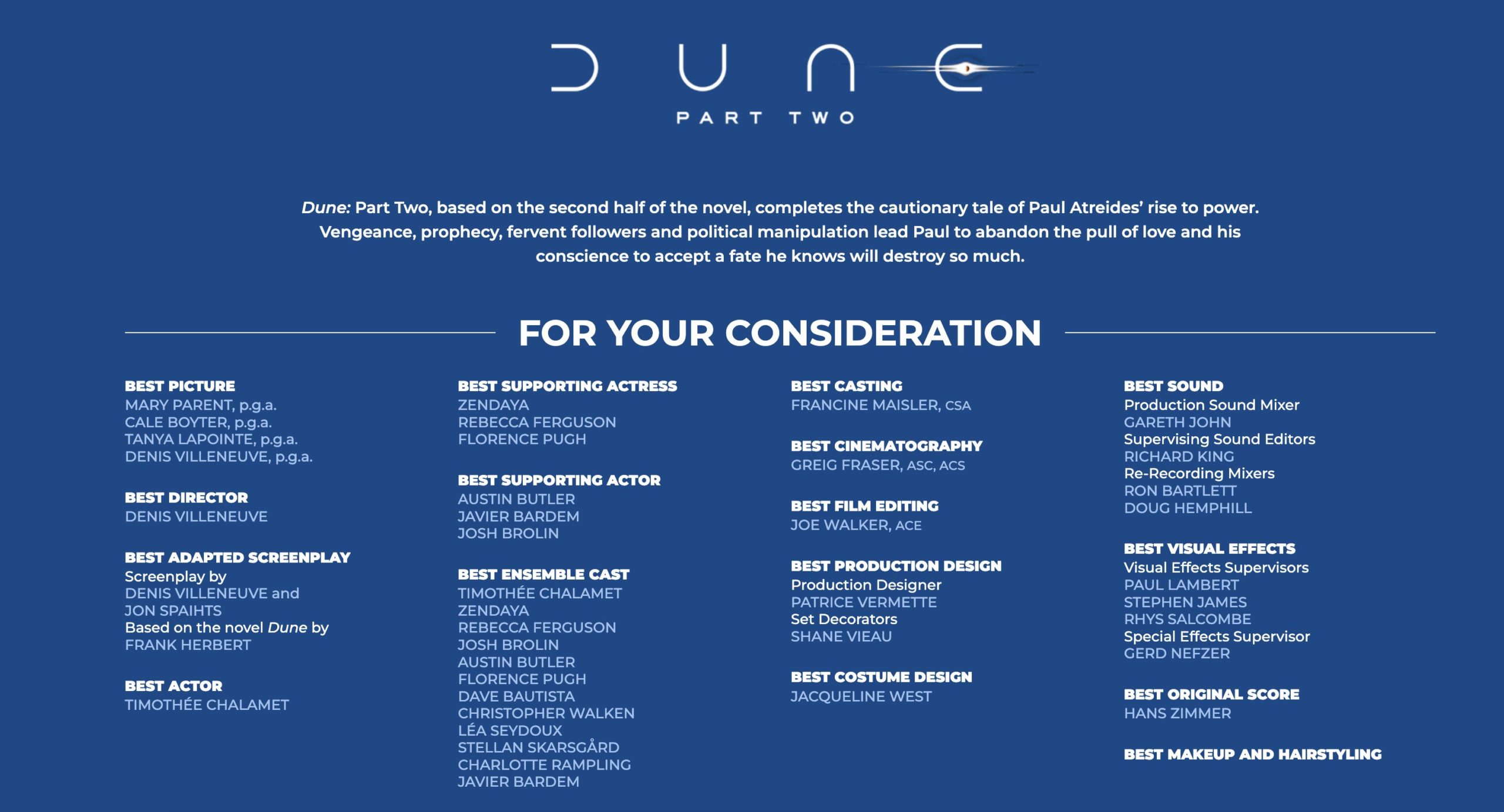 Variety dio la exclusiva de que Hans Zimmer no optará este año al Oscar por “Dune. Parte 2” ya que una de las reglas para poder competir en el apartado de mejor música es que, al menos, el 80% de la partitura sea original, circunstancia que en este caso no se da al utilizar el compositor alemán demasiado material de una primera entrega con la que sí que consiguió la estatuilla en la edición de 2022. En todo caso no está todo perdido para Hans Zimmer ya que podría sumar una nueva candidatura (lleva 12 hasta el momento) por su labor en "Blitz" de Steve McQueen.