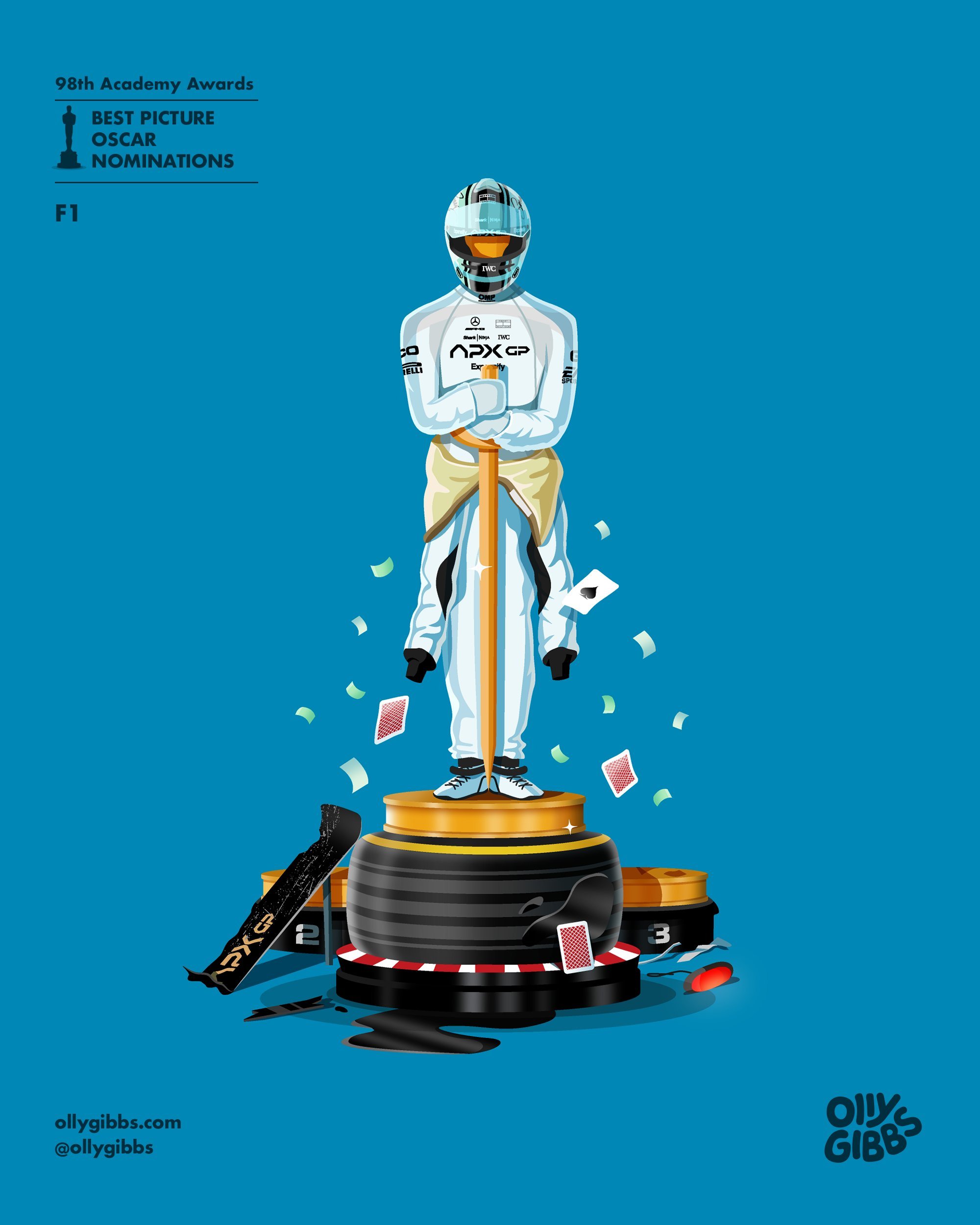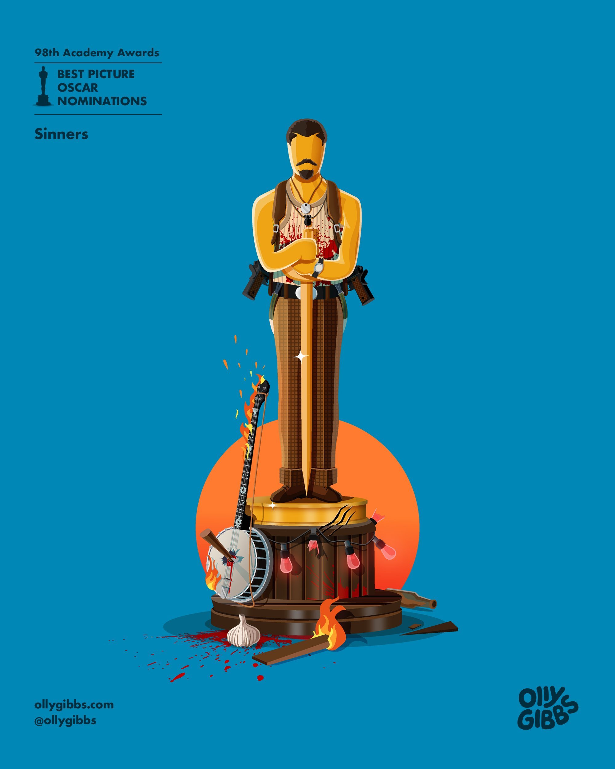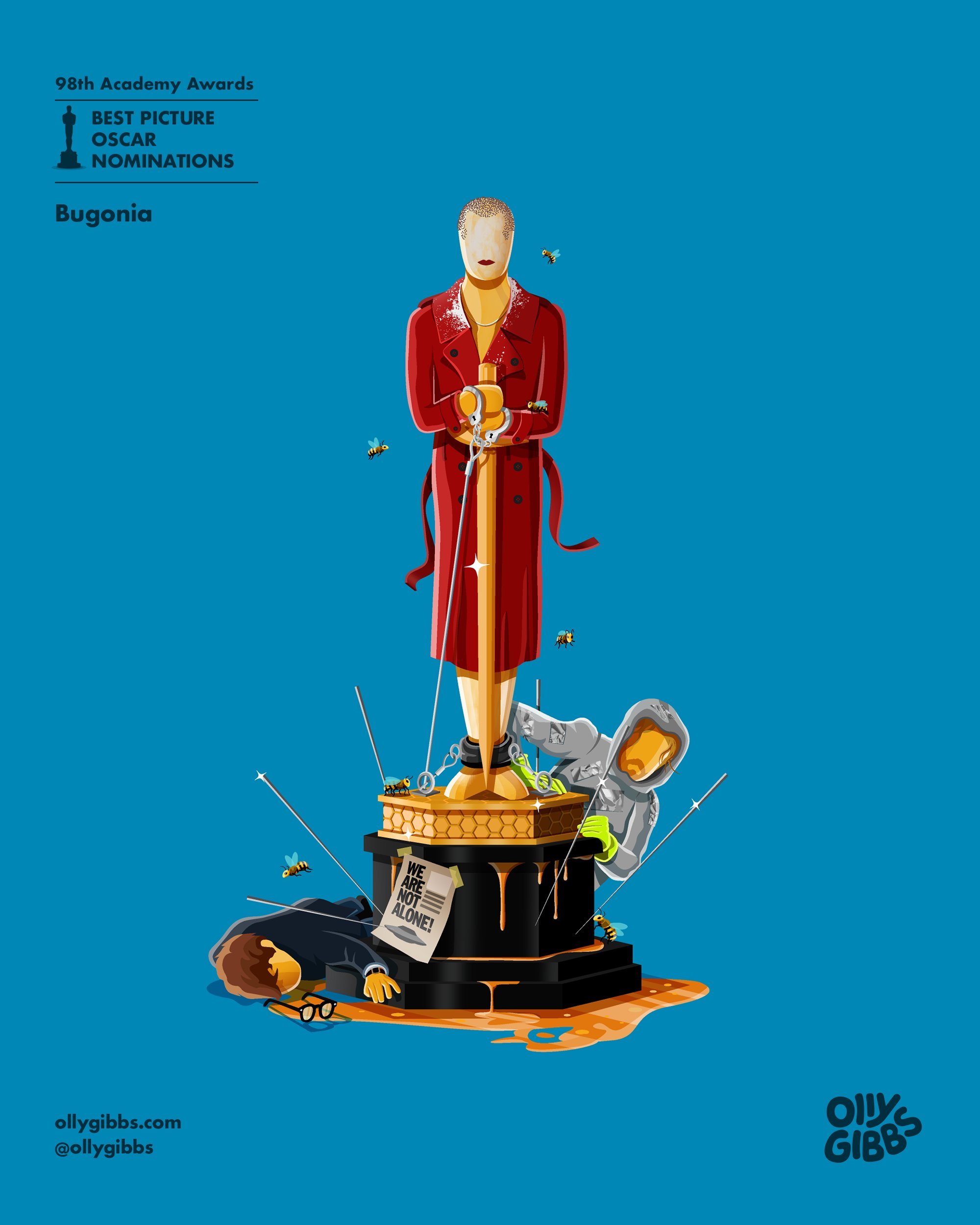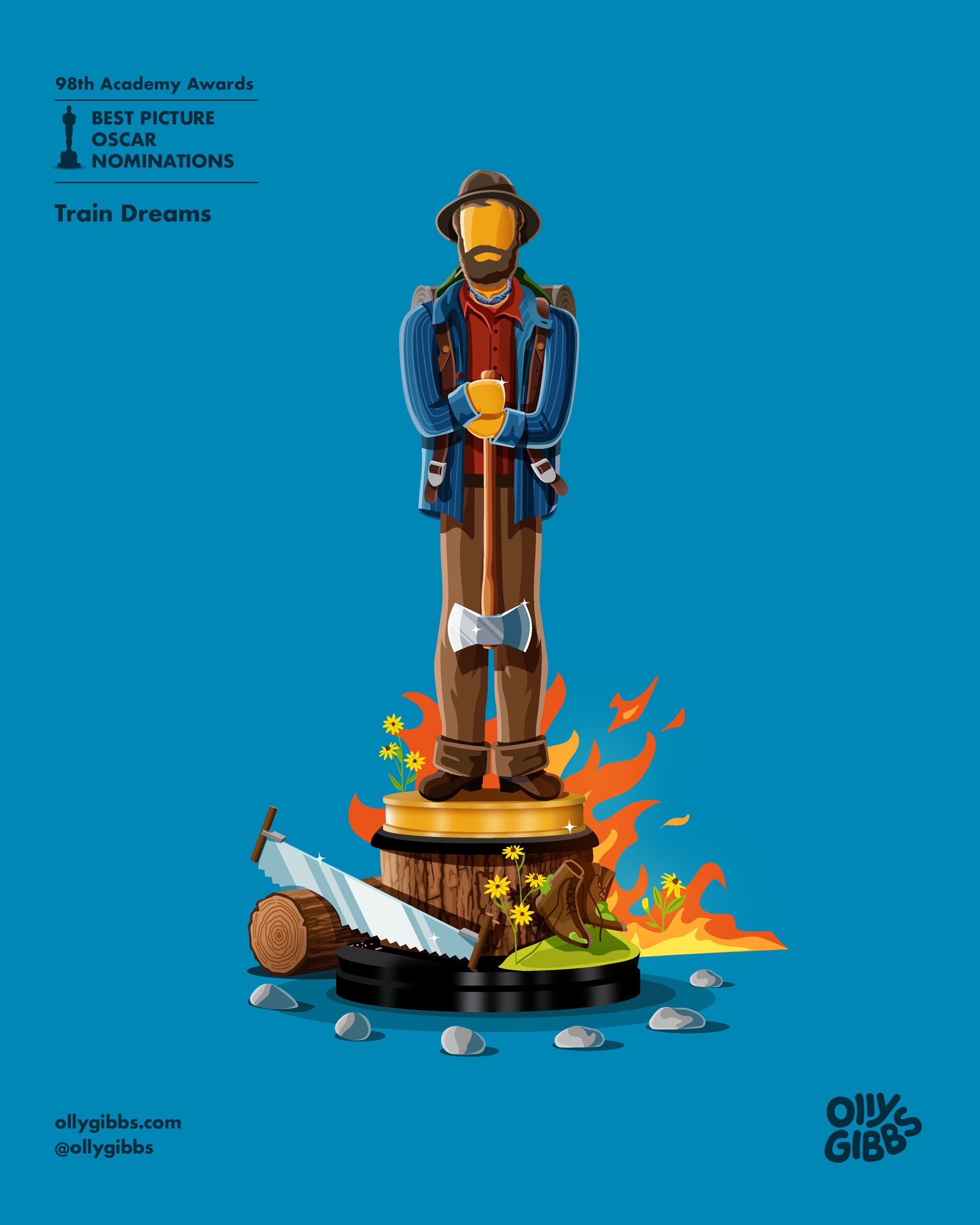 Las ilustraciones de Olly Gibbs son un clásico en la temporada de premios hacia el Oscar. Una tradición que mantiene desde el año 2014 pudiendo consultar desde su web todo el trabajo que este artista gráfico ha desempeñado durante este tiempo a la hora de sacar la esencia, desde su punto de vista y estilo personal, siempre con un toque curioso y simpático, de las candidatas al Oscar a mejor película. Una manera de desengrasar en este momento en el que la carrera echa fuego en esta apasionante recta final más emocionante de lo que pensábamos.
