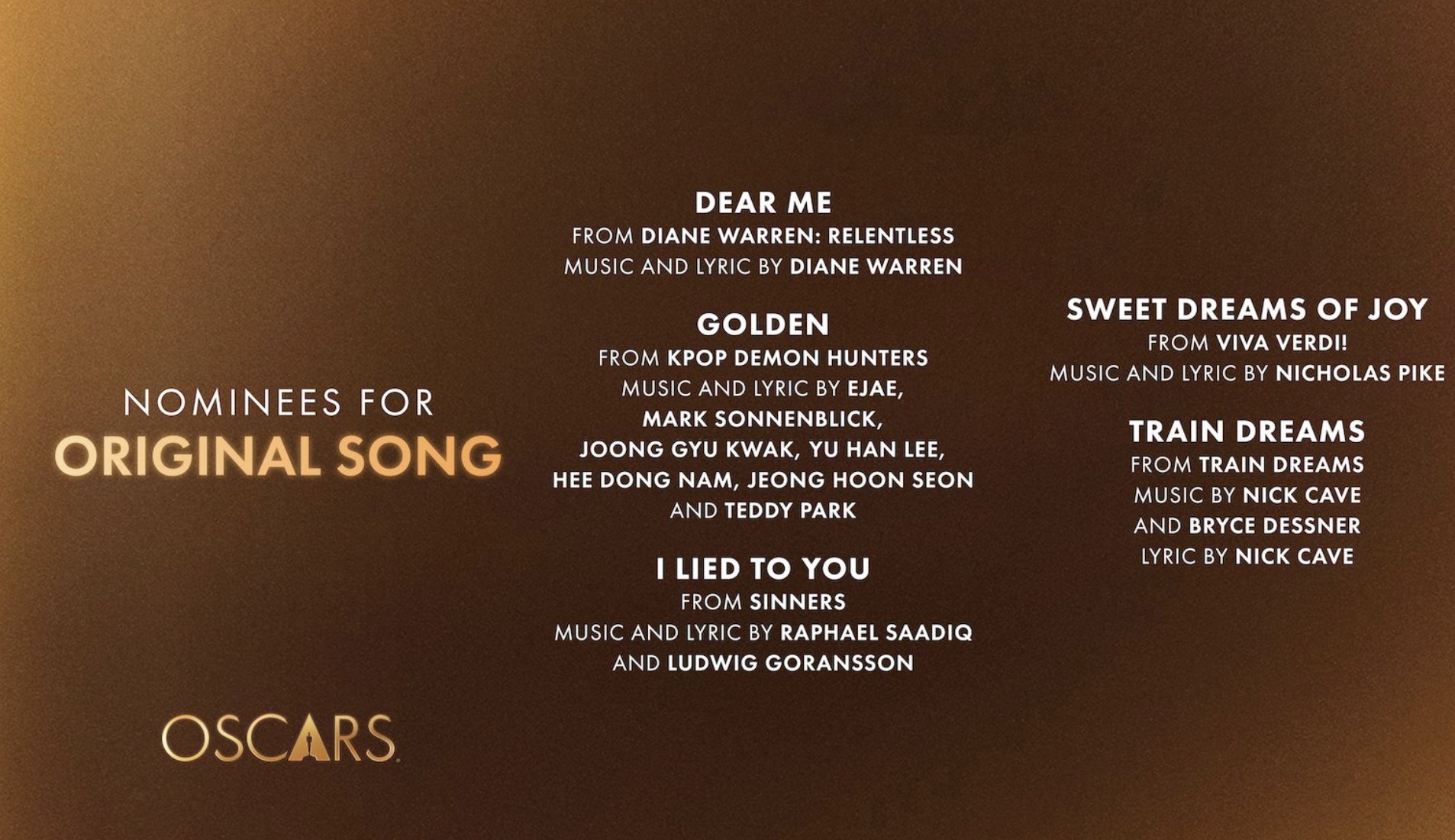 Golden de “Las guerreras k-pop” e I lied to you de “Los pecadores” son las canciones que tendrán el honor de ser interpretadas mientras que las otras tres candidatas tendrán un pequeño segmento que reconocerá su labor pero no interpretándose en vivo en pro de la cohesión de la gala y el sentido del espectáculo