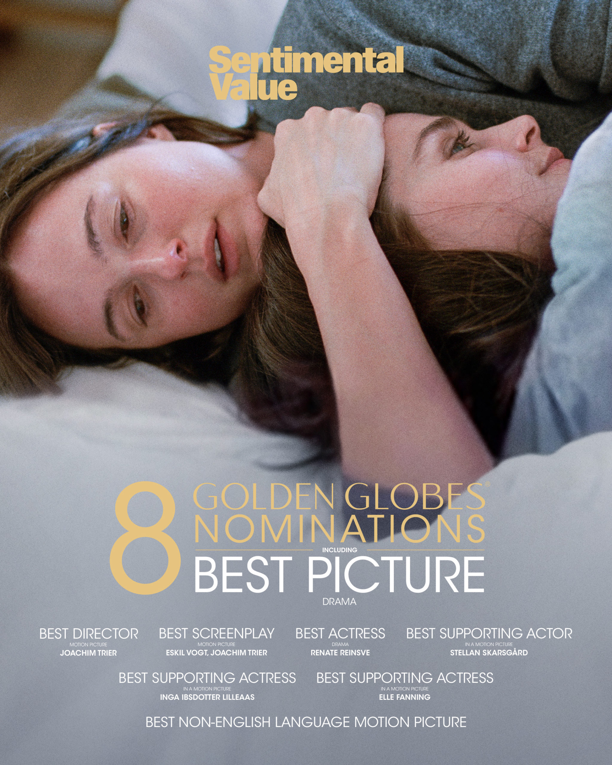 * El cine internacional demuestra su poderío esta temporada teniendo a tres nominadas en película de drama ("Valor sentimental", "Un simple accidente" y "El agente secreto") y dos en comedia o musical ("No other choice" y "Nouvelle Vague"). "Sirat" completa el círculo con dos nominaciones (música y película de habla no inglesa) que lleva a que NEON acapare cinco de las seis plazas en el apartado de película internacional.