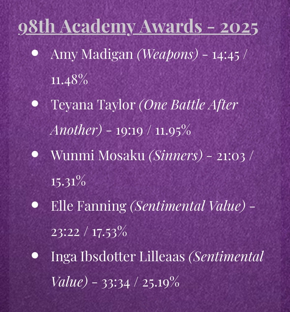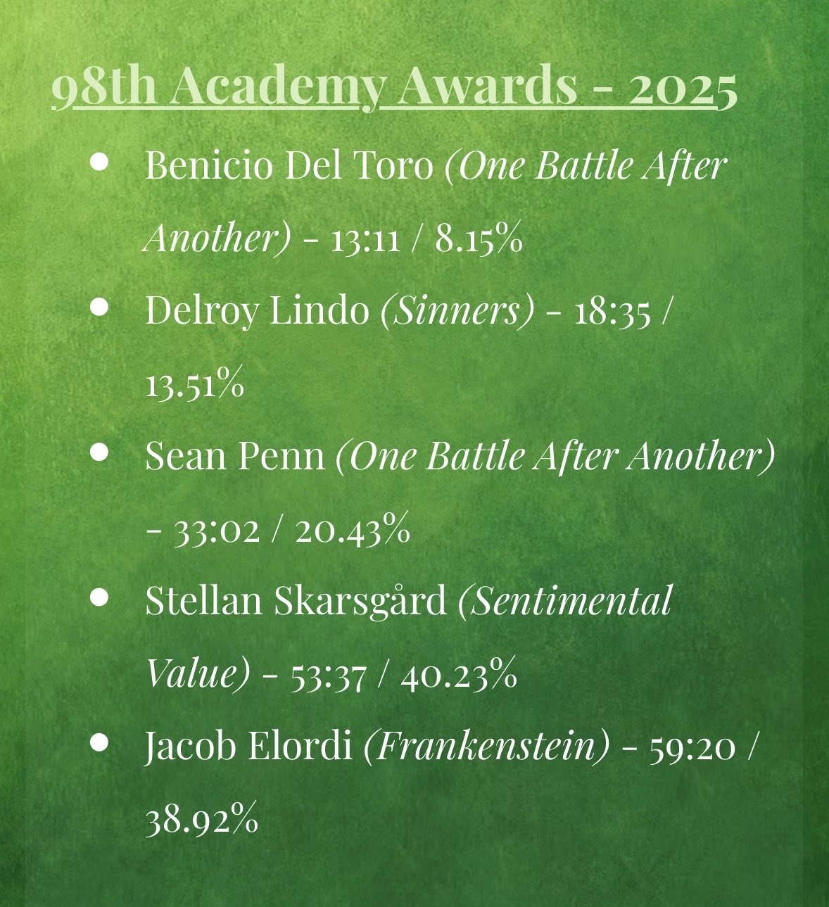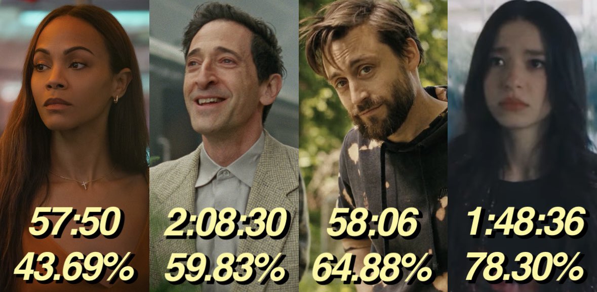 * Tras la victoria el año pasado de cuatro actores protagonistas (Kieran Culkin y Zoe Saldaña lo eran a pesar de ganar como intérpretes de reparto) este año se normaliza el promedio según los datos del siempre imprescindible en redes Matthew Stewart.