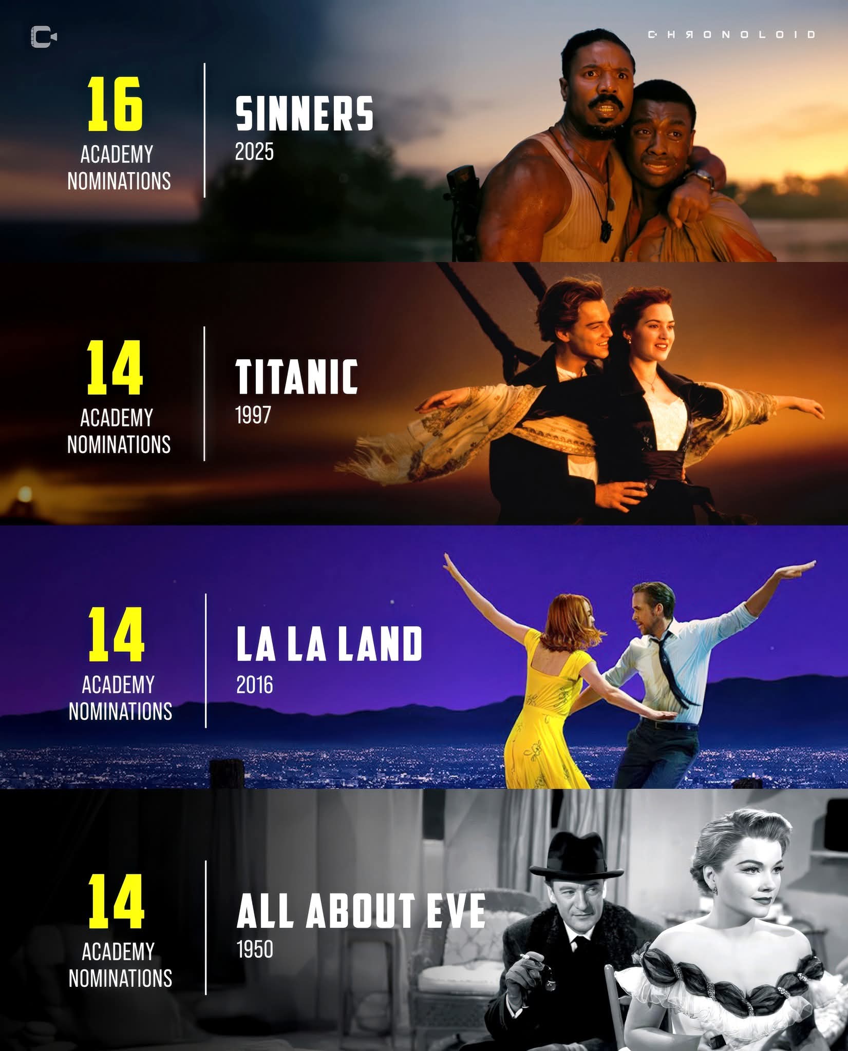 * Han tenido que pasar 98 años (y 75 años desde la primera que puso el listón en 14 nominaciones) para que una película de género haya batido todos los récords de candidaturas. "Los pecadores" reina en el listado histórico de los Oscar con 16 nominaciones frente a las 14 de "Eva al desnudo" en 1951, "Titanic" en 1998 y "La la land" en 2017. La proeza se hubiera conseguido incluso aunque no se hubiera creado la categoría de mejor casting.