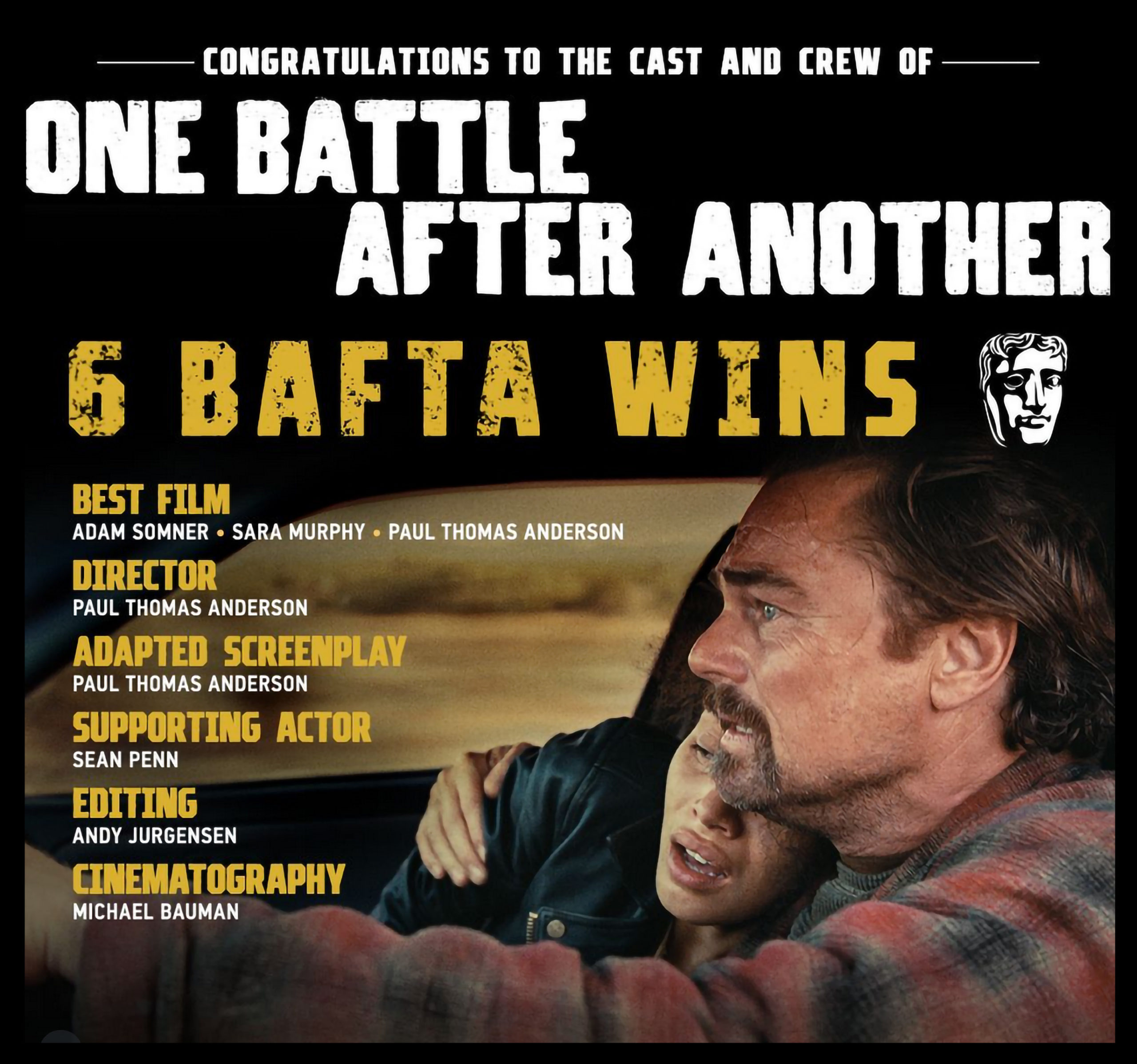 * Una batalla tras otra: 6 Bafta (película, dirección, actor de reparto, guión adaptado, fotografía, montaje)
