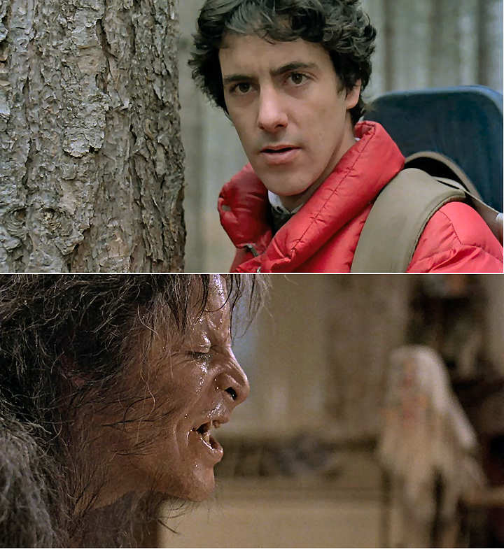 Además, el gurú Baker, logró un hecho sin precedentes, pues si bien ya se habían entregado sendos Oscar especiales de la Academia de Hollywood en 1964 por “Las siete caras del doctor Lao”, y en 1968 por “El planeta de los simios”, que fue dejar estupefacta a toda la industria cinematográfica hollywoodiense, la cual no tuvo más remedio que instaurar como categoría fija en los Oscar el premio al mejor maquillaje para poder entregárselo sin contemplaciones, y en las mismas condiciones que para el resto de categorías a raíz de su impresionante labor en esta película. Llama la atención el cuidado trabajo en el paulatino demacre de Jack en sus continuas apariciones como muerto viviente, a su amigo David a lo largo de la peli, inquiriéndole a que se quite de en medio; o en el aspecto sanguinolento y visceral de las víctimas que la fiera iba dejando. Aunque si algo pasará a los anales de la Historia del cine con mayúsculas, será la escena de la primera transformación de David en hombre lobo. Sinceramente, uno ha visto pocas cosas como esta en tantísimos años de pasión por el cine, sea de terror o no. Espectacular, impresionante, espeluznante, asombroso, increíble… fascinante… y así hasta acabar este artículo. Recordemos que estamos en 1981. Hoy apenas tendría valor con el servicio de tanto ordenador y técnica informática. Por entonces es de un mérito incalculable, ya no sólo el resultado, sino simplemente imaginarlo y atreverse a plasmarlo de aquella forma tan realista. Aunque la interpretación de David Naughton no me parece de lo mejor de la peli, en esta escena borda la situación fotograma a fotograma, igual que el genio de Rick que tenía pensado hasta el milímetro de la mutación de hombre a lobo. Sin parangón.