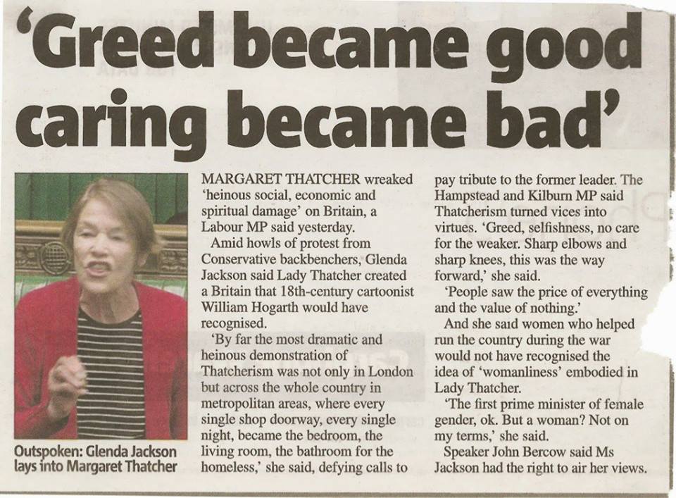Glenda Jackson fue muy crítica con Margaret Thatcher y a finales de la década de los 80 cada vez estaba más implicada en el activismo político en concreto en defensa de las clases más desfavorecidas ante la implicación en ello debido a sus orígenes humildes, participó en la campaña contra el “apartheid” en Sudáfrica y estuvo en Etiopía en 1986 como integrante de Oxfam. En 1991 anunció que se retiraba de la interpretación para ser una parte activa de la escena política, algo que inicialmente no fue tomado en serio. Ingresó en el Partido Laborista y un año después obtuvo un escaño en el Parlamento británico.