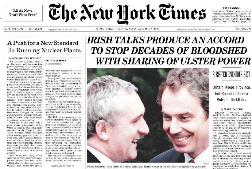 En 1994 se anunció la primera tregua del IRA que se rompió año y medio después. El segundo alto el fuego llegó el 19 de julio de 1997 que facilitó la firma del Acuerdo del Viernes Santo en donde participaron el gobierno de Gran Bretaña e Irlanda y que fue aceptado por la mayoría de los partidos políticos irlandeses y refrendado por el 95% de la población en Irlanda y en el Ulster por el 71%.