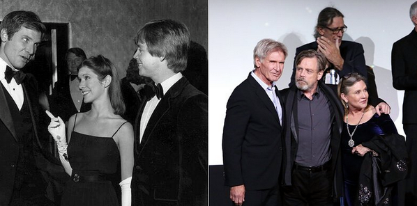 * 38 años separan estas imágenes llenas de nostalgia del trío original de “Star Wars” en la premiere de la película de 1977 y la de 2015.