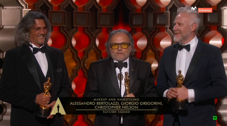 02:56h: Kimmel habla de las "noticias falsas" de CNN y da paso a Kate McKinnon y Jason Bateman que presentan los primeros premios técnicos. Maquillaje y peluquería para "Escuadrón Suicida" y vestuario para "Animales fantásticos y dónde encontrarlos" que supone el cuarto Oscar para Colleen Atwood tras "Chicago", "Memorias de una geisha" y "Alicia en el país de las maravillas".
