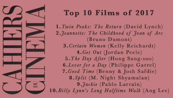 Por su parte, Cahiers du Cinéma se queda con "Twin Peaks. El regreso" como mejor película del año en su también habitual Top 10.