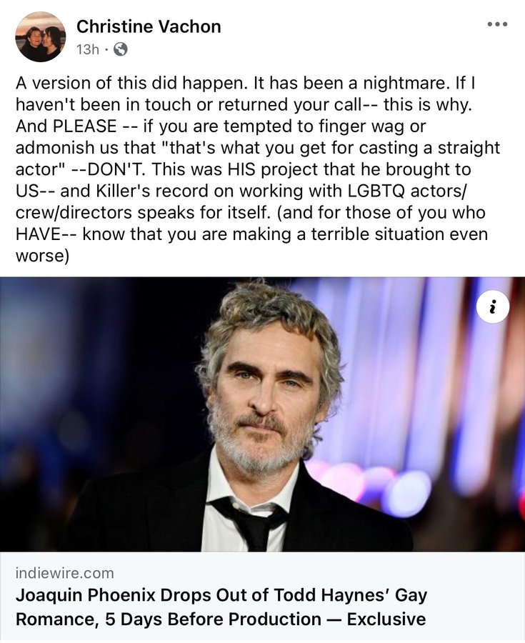 No sabemos como afectará esto a la carrera del actor (que pronto iniciará la promoción de la secuela de "Joker") pero desde luego después de esta incidencia su imagen en la industria ha caído en picado y las redes se han llenado de críticas al actor. A continuación las declaraciones en redes de la productora Christine Vachon, parte implicada en el proyecto.
