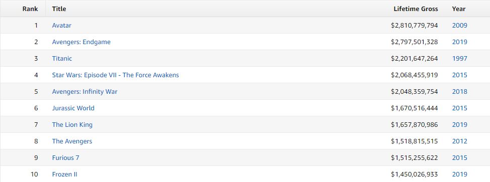 * Los directores de “Los vengadores: Endgame” han querido felicitar a “Avatar” por quitarles en su reestreno el puesto de película más taquillera de la Historia. Seguramente Marvel no ha tenido la última palabra en este duelo en la cumbre. Así queda el top 10 histórico a día de hoy.