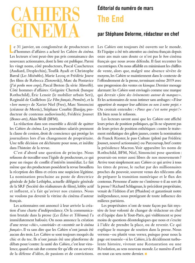 * Francia ha estado revuelta este fin de semana con todo lo relacionado con los César y los premios que ha ganado Roman Polanski pero todavía ha habido más con el hecho del posible fin de Cahiers du Cinéma tal y como lo conocemos. La mítica revista fundada en 1951 como precursora de un modo de ver el cine que más tarde explotaría con el movimiento de la Nouvelle Vague. El consejo editorial al completo, formado por 15 empleados, ha dimitido ante el cambio de rumbo que se presume para la publicación adquirida por nuevos propietarios que pretende darle un enfoque más amable, accesible y chic lo que para los miembros del consejo amenazaba con "crear un conflicto de intereses para una publicación crítica" ya que entre ellos habrá ocho productores (con Julie Lethiphu como directora general, hasta ahora responsable de la Sociedad de Directores de Cine) por lo que se antoja difícil la objetividad e integridad de los contenidos. Malos tiempos para la lírica y para las publicaciones en papel, ante la disminución de lectores analógicos, lo que ha debilitado otras perspectivas y contenidos de calidad en contra de la rentabilidad. La banalidad que está haciendo estragos en el sector de la comunicación parece cobrarse una nueva víctima.