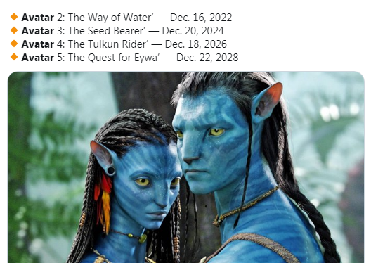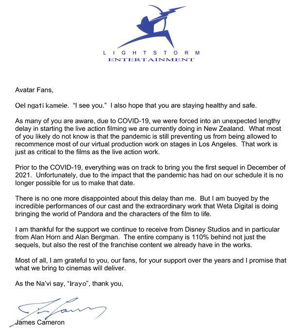 Actualización (23/07/2020): Cambios en la fecha de estreno de las secuelas de "Avatar" retrasándose un año según lo previsto debido a la crisis pandémica.