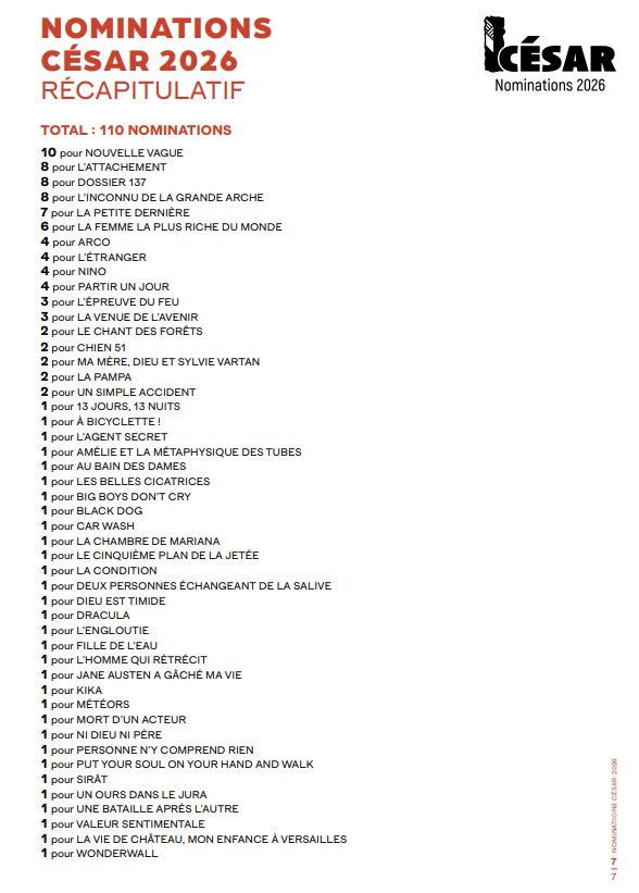 Se han quedado a las puertas de entrar en el quinteto, presumiblemente, "El arquitecto" de Stéphane Demoustier (8) y "La mujer más rica del mundo" de Thierry Klifa (6), ambas fuera de competición en el Festival de Cannes 2025, pero el que sigue sin convencer a la Academia gala no es otro que François Ozon que con "El extranjero" (con la cual compitió en el Festival de Venecia) solo es capaz de optar a 4 premios. Por su parte, "Sirat" prosigue su romance internacional y opta al premio a la mejor película internacional.