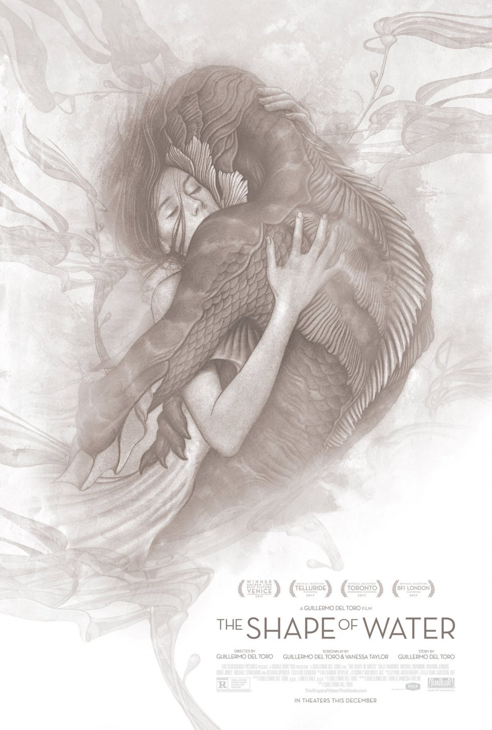 La cinta nos lleva a 1963, en plena Guerra Fría, para contar la historia de una mujer muda que empieza a trabajar como conserje en un laboratorio en el que se alberga a un gigantesco anfibio, una extraña figura que hará nacer sentimientos en la protagonista saliendo ella así de una vida monótona e intrascendente. En el reparto Sally Hawkins, Michael Shannon, Richard Jenkins, Michael Stuhlbarg, Octavia Spencer y Doug Jones. Fox Searchlight estrenará la película en USA el próximo 1 de Diciembre y a España llegará el 16 de Febrero de 2018.